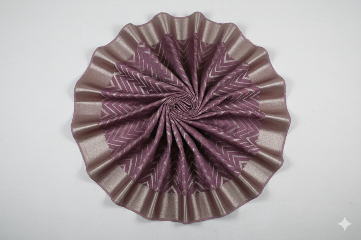 Elevate your style with this exquisitely modern and elegant dusky rose (mauve/purple-grey) saree. The body of the saree features a striking all-over chevron (zig-zag) pattern woven in a subtly shimmering thread, giving it a unique geometric texture. This contemporary design is beautifully framed by a broad metallic brocade border in a matching dusty gold/rose gold tone, creating a refined and sophisticated look.